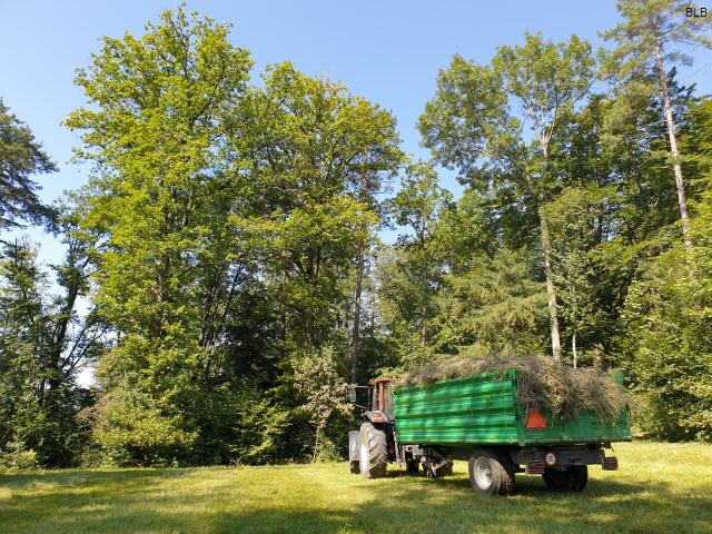 Am Morgen lag dichter Nebel und das Schnittgut war noch feucht vom Regen der Vortage. Der Nebel lichtete sich aber bald und die Sonne trocknete den Boden. Da 11 Personen zügig mithalfen, ging das Rechen und Aufladen auf dem «Mätteli» schnell voran. Danach arbeiteten wir am Korridor zum Chalenmösli und am unteren Waldrand. Auch dort war die Arbeit bald getan, sodass wir bis Mittag fertig waren. Danach nahmen wir auf dem «Mätteli» den Imbiss ein, diskutierten noch eine Weile und genossen den schönen Tag.